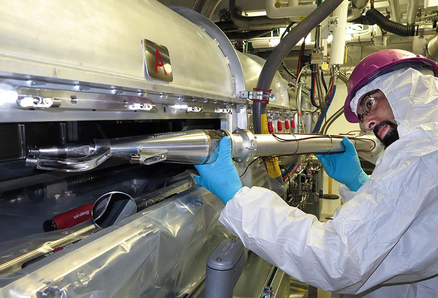 Operator obszaru docelowego NIF, Mike Morris, instaluje detektor czasu przelotu cząstek (PToF) / filtr krawędziowy (WRF) spektrometru protonów w manipulatorze przyrządu diagnostycznego do wystrzału kapsuły o symetrii węglowej (diamentowej) o wysokiej gęstości. Aut. lasers.llnl.gov
