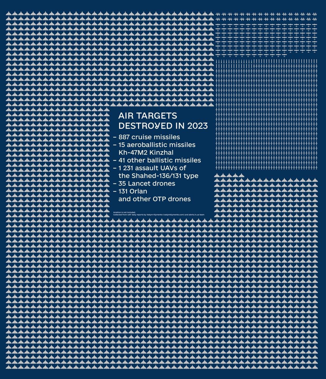 Wśród zestrzelonych elementów dominują drony irańskiego typoszeregu Shahed-131/136 (Znane pod rosyjskim oznaczeniem Gierań-2). Tych latających bomb w ciągu całego poprzedniego roku ukraińska obrona powietrzna zestrzeliła 1231. Drugim najpopularniejszym celem były rakiety skrzydlate i manewrujące, których miano zestrzelić 887 sztuk. Rosjanie używają dużej liczby rakiet manewrujących do atakowania celów na Ukrainie. Wśród nich są pociski lotnicze jak m.in. Ch-101 wystrzeliwane z bombowców Tu-95MS, pociski bazowania morskiego Kalibr oraz lądowego systemów Iskander-K (R-500).