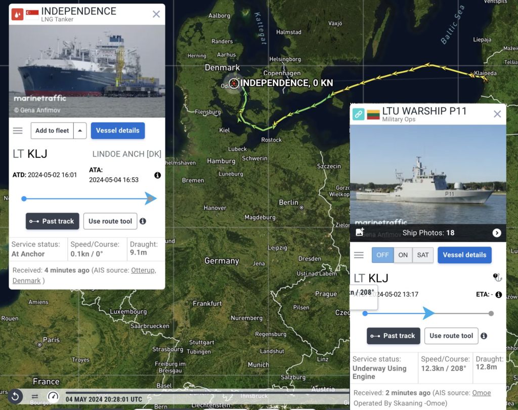 W trakcie rejsu jednostki, eskortował ją okręt litewskiej marynarki wojennej P11 ŽEMAITIS. Obecnie okręt wraca na Litwę. FSRU Independence jest strategicznym aktywem Litwy, stąd decyzja o towarzyszeniu jej okrętu wojennego w czasie przejścia z Kłajpedy do Odense.
