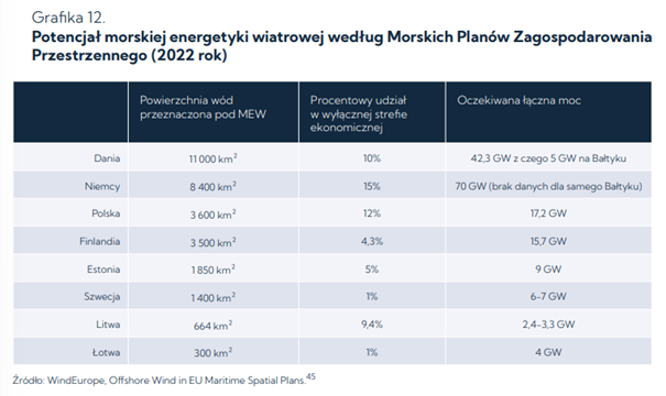 Dodatkowo, w raporcie wskazano, że Morze Bałtyckie posiada potencjał 93 GW morskiej energetyki wiatrowej, z czego – zdaniem Polskiego Stowarzyszenia Energetyki Wiatrowej – potencjał Polski wynosi 33 GW, co pozwoliłoby na pokrycie 60 procent zapotrzebowania na energię elektryczną nad Wisłą. Wynika to z płytkości morza i niskich fal. Dodatkową zaletą jest możliwość rozwoju infrastruktury wodorowej (współpracującej z wiatrakami) oraz CCS (wychwytującej i składującej dwutlenek węgla).