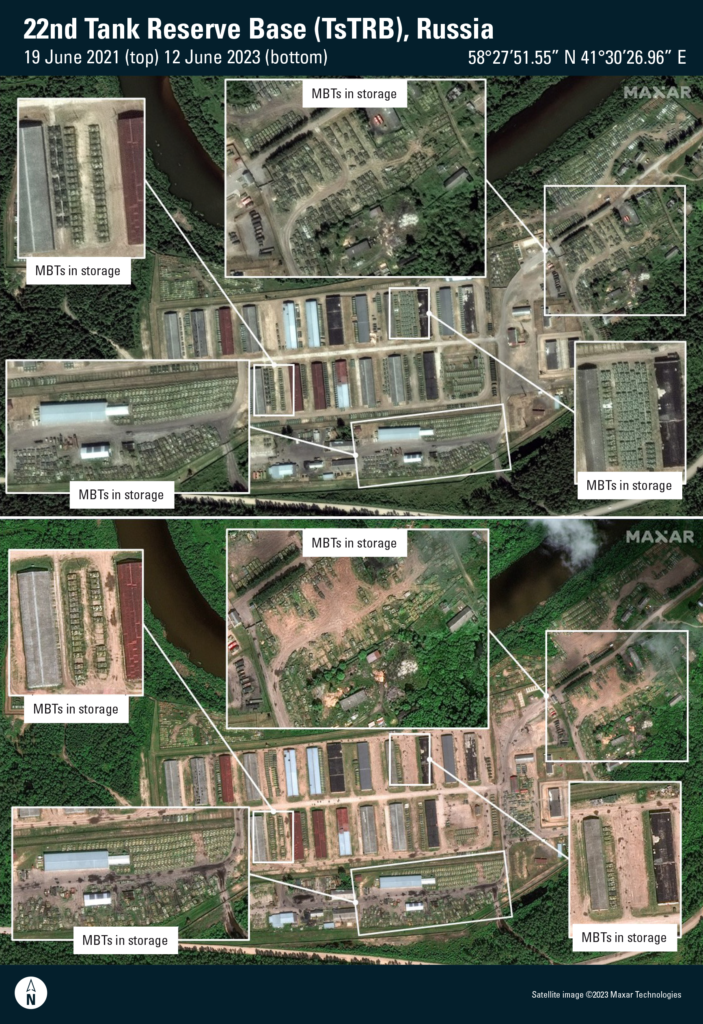 Na poniższym zdjęciu u góry zaprezentowano stan magazynowy 22 składu czołgowego z 2021 roku, poniżej ten sam skład z 2023 roku.