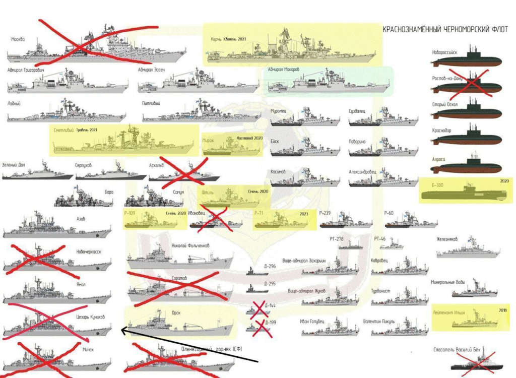 Do 14 lutego Rosjanie utracili co najmniej 14 okrętów wchodzących w skład Floty Czarnomorskiej. Wśród nich bezpowrotnie stracono 3 okręty proj. 775 (Mińsk, Nowoczerkask i Cezar Kunikow) a jeden został uszkodzony – Olenogorski Górnik – również po ataku morskich dronów. Przed wojną we Flocie Czarnomorskiej służyło sześć tego typu okrętów.