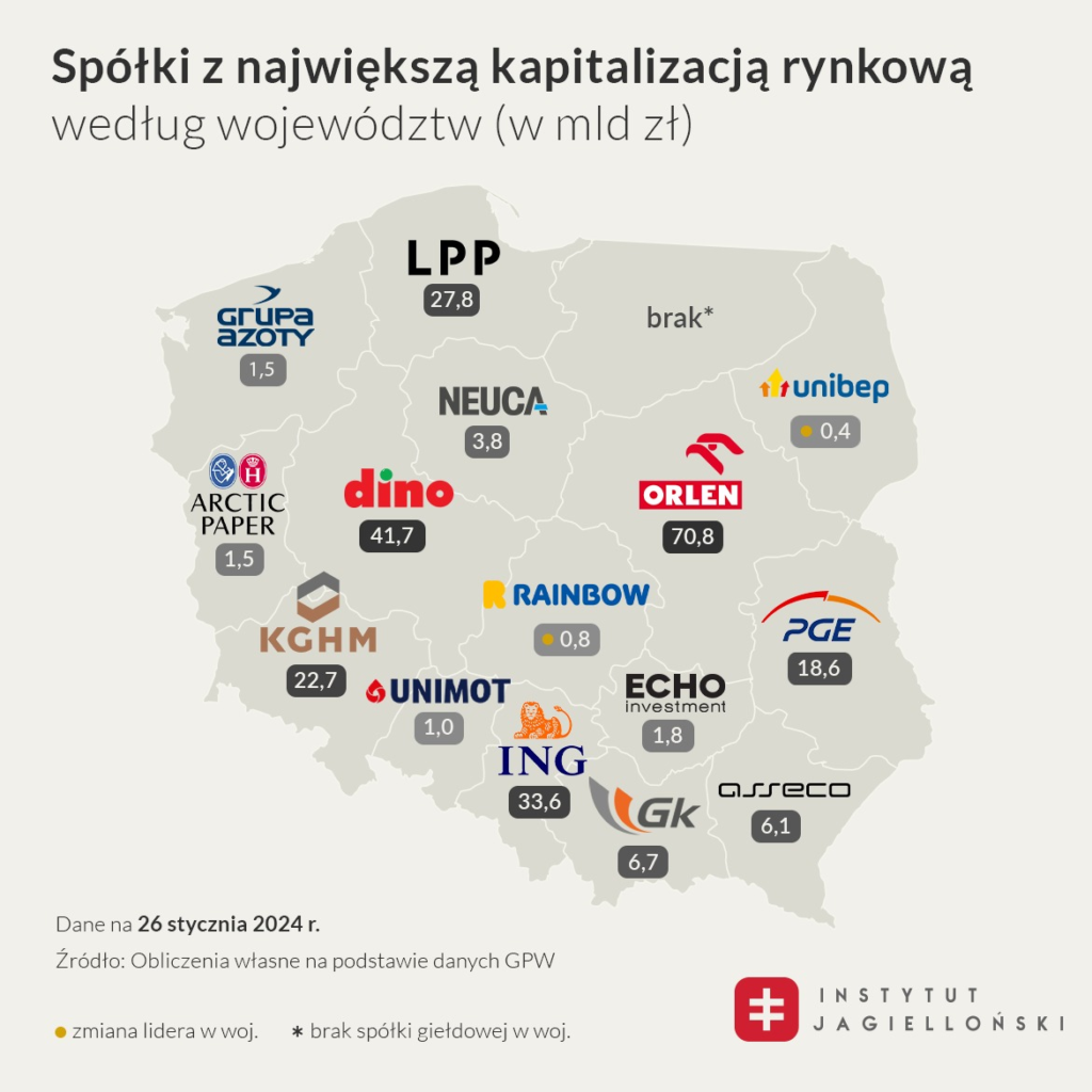 Według najnowszej mapy, sporządzonej przez Instytut Jagielloński, największą firmą pod względem kapitalizacji rynkowej pozostaje Orlen. Z kolei największe wzrosty kapitalizacji rynkowej zanotowały ING Bank Śląski (11,8 mld złotych), LPP (9,8 mld złotych), PGE (4,6 mld złotych) oraz Dino (3,5 mld złotych). Wobec czerwca 2023 roku zmiany nastąpiły w województwie łódzkim (zamiast MIRBUD S.A. spółką z największą kapitalizacją jest obecnie UNIMOT) oraz podlaskim (zamiast #AC Auto Gaz mamy UNIBEP).