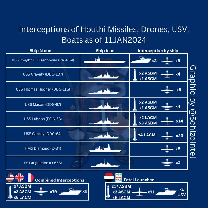 Dane zebrane na podstawia komunikatów m.in. przez U.S Central Command zebrał użytkownik platformy X pod nickiem Intel Schizo. Na 11 stycznia 2024 roku koalicji składającej się z okrętów wojennych USA, Francji i Wielkiej Brytanii udało się zestrzelić 79 dronów (irańskiej produkcji typów Shahed), 7 balistycznych pocisków przeciwokrętowych, dwóch przeciwokrętowych pocisków kierowanych, oraz 6 rakiet manewrujących. Dodatkowo siły okrętowe zniszczyły 3 łodzie Huti.