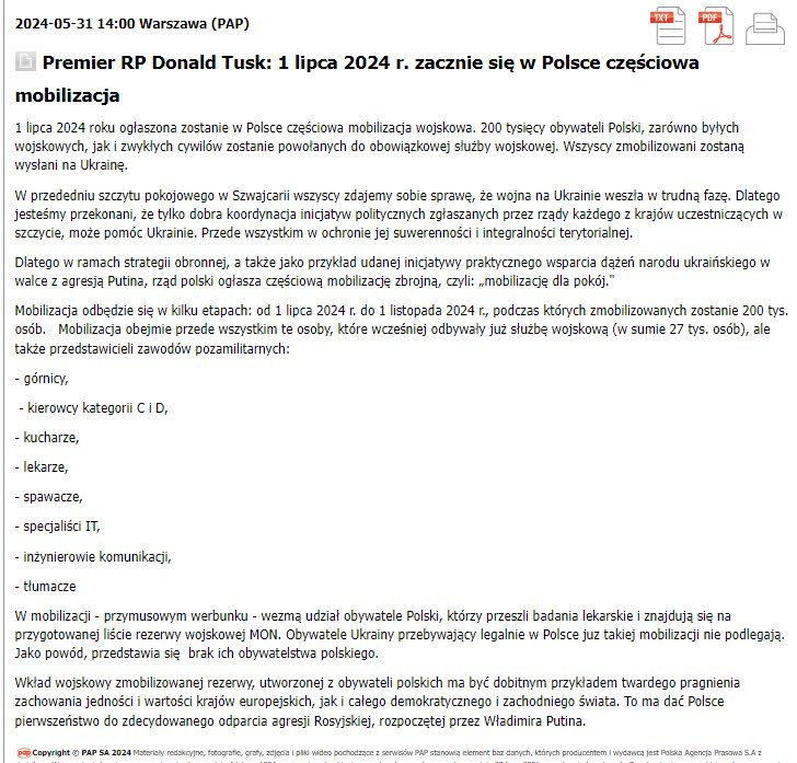 Po godzinie 14:00 na stronach PAP dwukrotnie pojawił się artykuł pod tytułem ” Premier RP Donald Tusk: 1 lipca 2024 r. zacznie się w Polsce częściowa mobilizacja”