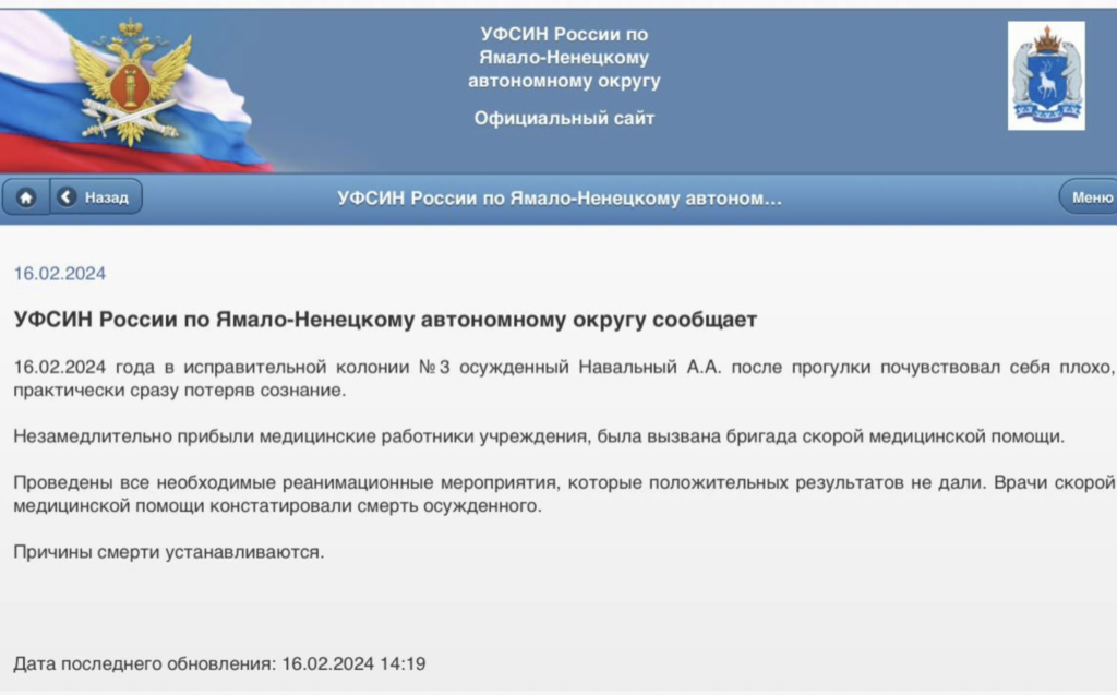 Według oświadczenia opublikowanego na stronie internetowej  Federalnej Służby Penitencjarnej Obwodu Autonomicznego Jamalsko-Nienieckiego Aleksiej Nawalny, który odsiadywał wyrok więzienia w kolonii karnej zmarł nad ranem 16 lutego.
