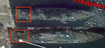 Dziś na telegramowym kanale KyberBoroshno pojawiły się zdjęcia satelitarne stojącego w stoczni okrętu z widocznym śladem trafienia rakietą w jego rufową część. Tam zlokalizowane są m.in. skomplikowane i drogocenne systemu rozpoznania radioelektronicznego okrętu, a więc jego główne narzędzie pracy.
