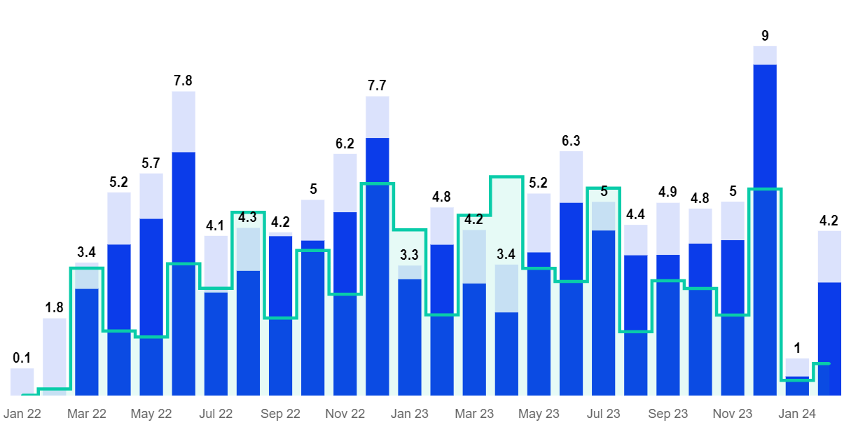 Sytuacja uległa pogorszeniu w 2024 roku. W styczniu jedyną transzą pomocy zagranicznej było 400 mln dolarów z Japonii. W lutym łącznie Japonia, Norwegia i Hiszpania przekazały 800 mln dolarów. To znacznie mniej niż potrzeba do zbilansowania wydatków. Dla porównania w lutym deficyt budżetowy wynisł 2,9 mld dolarów, a 1,3 mld dolarów wyniosło spłacenie odsetek od kredytów.