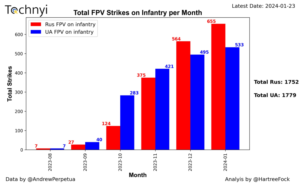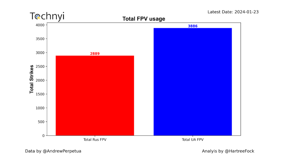 Według projektu Tocznyj, który zajmuje się analizą wykorzystania dronów FPV, od początku badań zarejestrowano już kilka tysięcy uderzeń dronami FPV. Należy jednak pamiętać, że nagrania nie dokumentują wszystkich ataków przeprowadzonych przy ich użyciu. Część dronów ulega awarii, błędom operatorów, część z nich jest zagłuszana przez wroga. Stąd statystyka nie jest pełna. Na zdjęciu poniżej ogólna liczba zarejestrowanych ataków dronów FPV. Póki co większą liczbą odznaczają się Ukraińcy, jednak Rosjanie w ostatnich miesiącach znacznie zwiększyli stopień wykorzystywania dornów FPV w swoich podoodziałach.